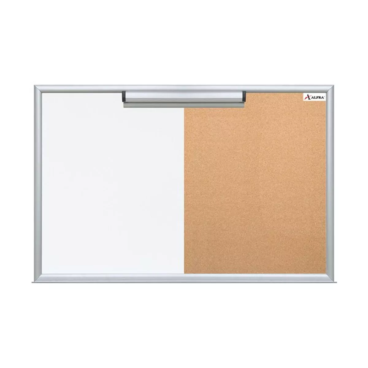 Pizarrón combinado de 90×120 cm con superficie blanca y corcho natural, marco de aluminio anodizado.