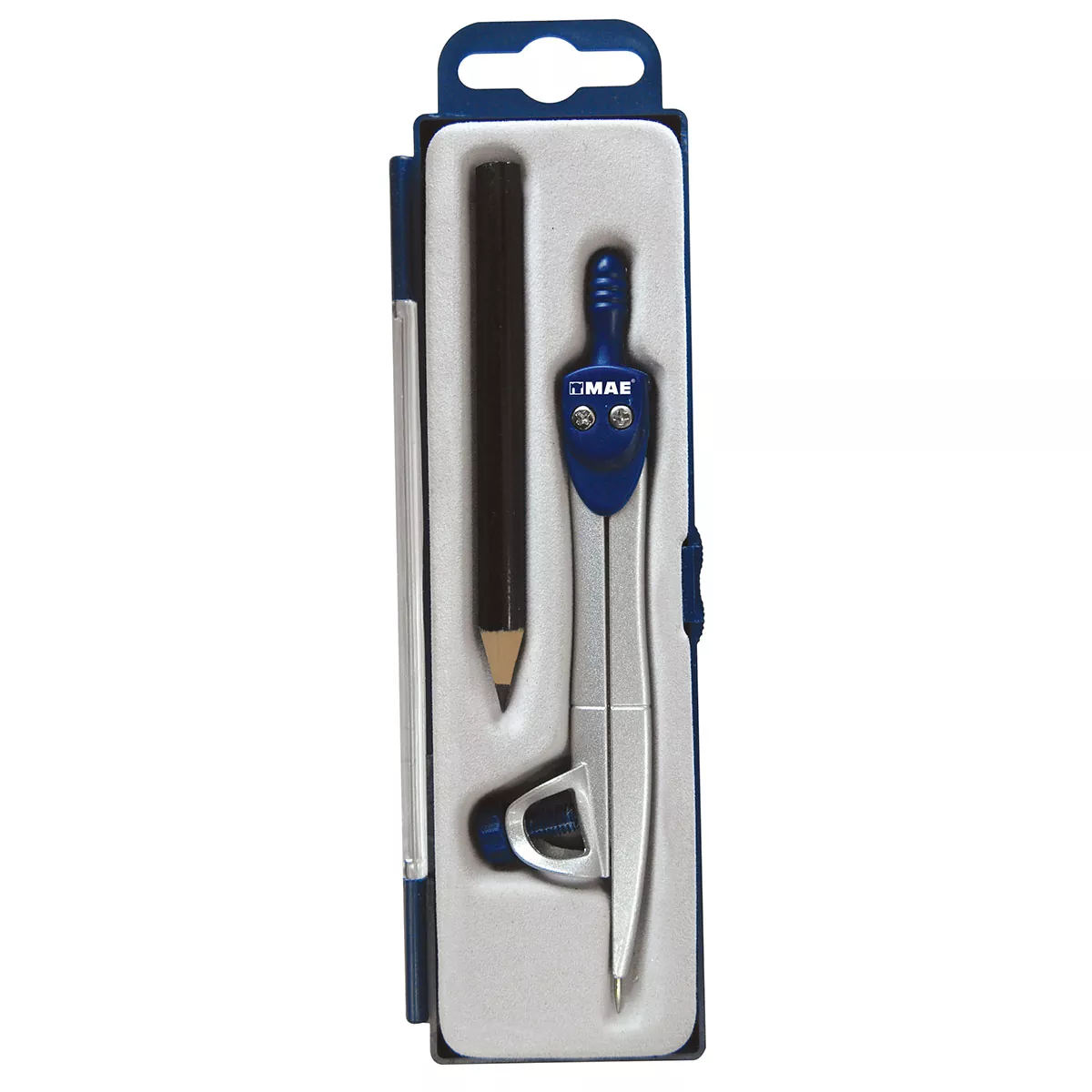 Compás escolar metálico en estuche con lápiz. Brazo de sujeción con tornillo para usar cualquier lápiz. Trazo máximo de 16.5 cm de radio. Atado de 6 pzas.