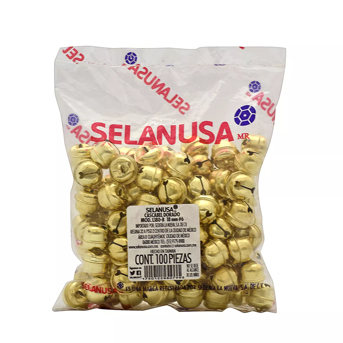 Cascabel metálico en color Oro, de 18 milímetros, ideal para trabajos de manualidades, bolsa con 100 piezas. Atado de 100 pzas.