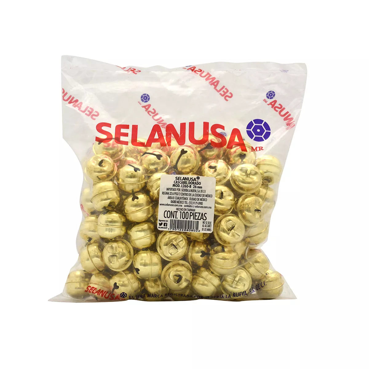 Cascabel metálico en color Oro, de 26 milímetros, ideal para trabajos de manualidades, bolsa con 100 piezas. Atado de 100 pzas.