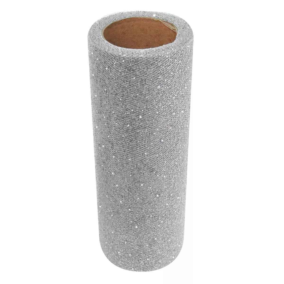 Tul Diamantado color Plata, es una tela tipo maya o red de hilos de poliéster, existen varios tipos desde muy grueso hasta muy fino, posee textura áspera y con volumen, medidas de 15 centímetros de ancho X 9 metros de largo. Atado de 1 pzas.