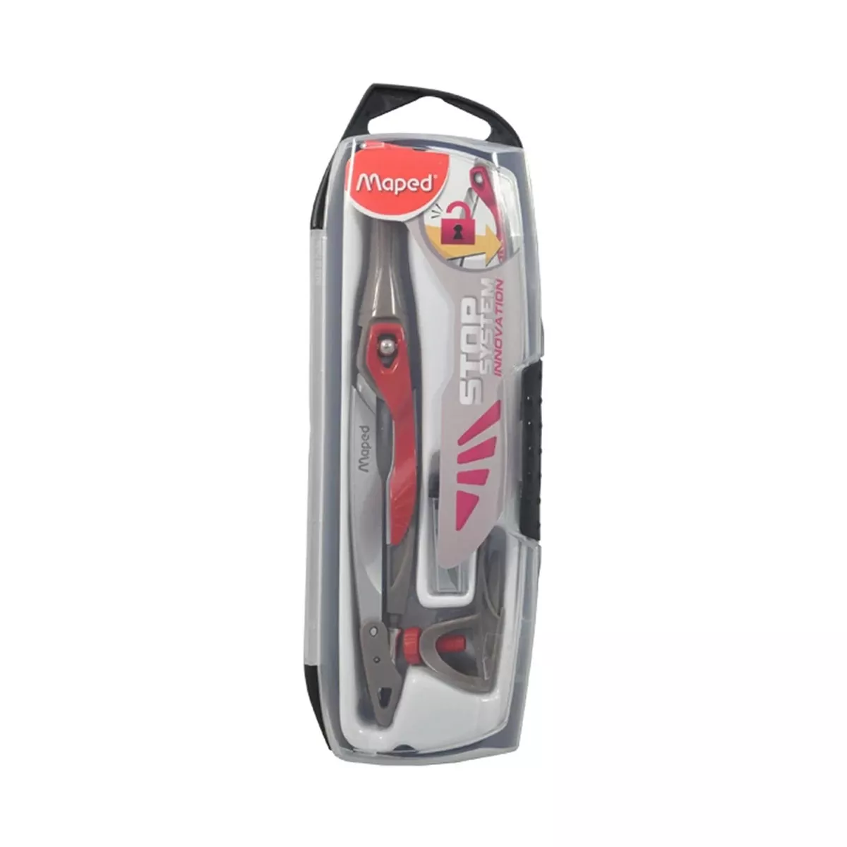 Innovación exclusiva de Maped. Concepto Stop System con patente: bloqueo de los brazos intuitivo Seguridad: protector de punta seca y mina. Incluye estuche para guardar Atado de 2 pzas.